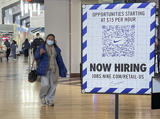 지난 3일 미국 일리노이주 거니의 쇼핑몰에서 시간당 15달러의 임금을 제공하겠다는 나이키의 구인광고 앞을 한 쇼핑객이 무관심하게 지나치고 있다. 노동력 부족 사태로 인해 올해 처음으로 저임금 업종에 대한 시간당 임금이 평균 15달러를 돌파했다. EPA 연합뉴스