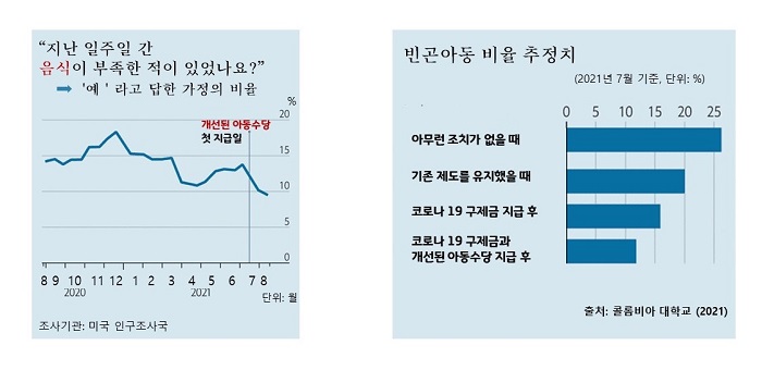 또한 인구조사국 설문조사에서 대부분의 가정이 지급받은 아동급여가 아동을 위한 음식과 생필품을 사는데 쓰였다고 응답했고, '지난 한주 간 음식이 부족한 적이 있었다’고 답한 가정의 비율이 7월 15일 이후 기존 13.7퍼센트에서 9.5퍼센트로 감소했다.